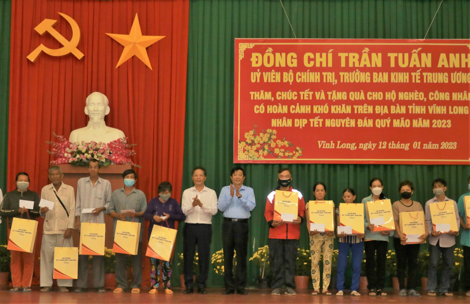 Tiếp đó, trong buổi chiều cùng ngày, đồng chí Trần Tuấn Anh và Đoàn công tác thăm, tặng quà cho hộ nghèo và công nhân lao động có hoàn cảnh khó khăn trên địa bàn tỉnh Vĩnh Long nhân dịp Tết Nguyên đán Quý Mão năm 2023. Phát biểu tại buổi tặng quà, đồng chí Trần Tuấn Anh nêu rõ, năm 2022, mặc dù đất nước đối diện với nhiều khó khăn, thách thức khó lường, nhưng với sự lãnh đạo, chỉ đạo sát sao của Đảng, sự điều hành quyết liệt, kịp thời của Chính phủ, sự vào cuộc của cả hệ thống chính trị, sự nỗ lực, đồng lòng của cộng đồng doanh nghiệp và nhân dân, kinh tế đất nước tiếp tục đạt được những chuyển biến tích cực, toàn diện trên nhiều lĩnh vực. Để đạt được những kết quả đó có sự đóng góp quan trọng của lực lượng đoàn viên, công nhân, viên chức lao động cả nước nói chung và của tỉnh Vĩnh Long nói riêng.