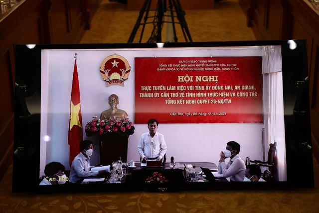 Chiều ngày 08/12/2021, Ban Kinh tế Trung ương tổ chức hội nghị trực tuyến làm việc với Tỉnh ủy Đồng Nai, An Giang, Thành ủy Cần Thơ về tình hình thực hiện và tổng kết Nghị quyết 26-NQ/TW của Ban Chấp hành Trung ương (Khóa X) về nông nghiệp, nông dân, nông thôn (gọi tắt là Nghị quyết 26-NQ/TW) trình Ban Chấp hành Trung ương (Khóa XIII). Tham dự tọa đàm có các đồng chí: Nguyễn Duy Hưng, Phó Trưởng Ban Kinh tế Trung ương, Phó Trưởng ban Thường trực Ban Chỉ đạo Tổng kết Nghị quyết 26-NQ/TW; Cao Đức Phát, Ủy viên Hội đồng Lý luận Trung ương, Nguyên Phó Trưởng Ban Thường trực. Tại các địa phương có các đồng chí: Hồ Thanh Sơn, Phó Bí thư Thường trực tỉnh Đồng Nai; Nguyễn Ngọc Hè, Phó Chủ tịch UBND Cần Thơ; Trần Anh Thư, Phó Chủ tịch UBND tỉnh An Giang. Dự tọa đàm có các thành viên Tổ Biên tập, Tổ Thư ký; đại diện một số vụ, đơn vị của Ban.