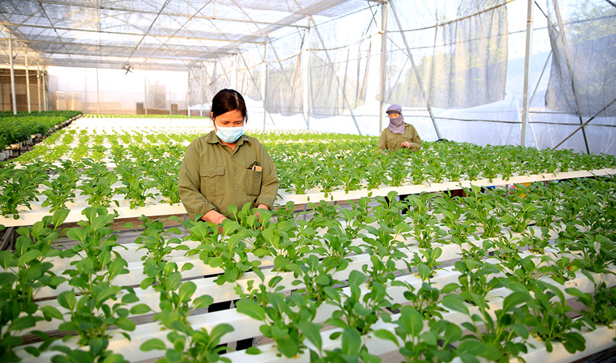 Chăm sóc rau tại Hợp tác xã Nông nghiệp công nghệ cao Đức Phát (xã Yên Mỹ, huyện Thanh Trì)