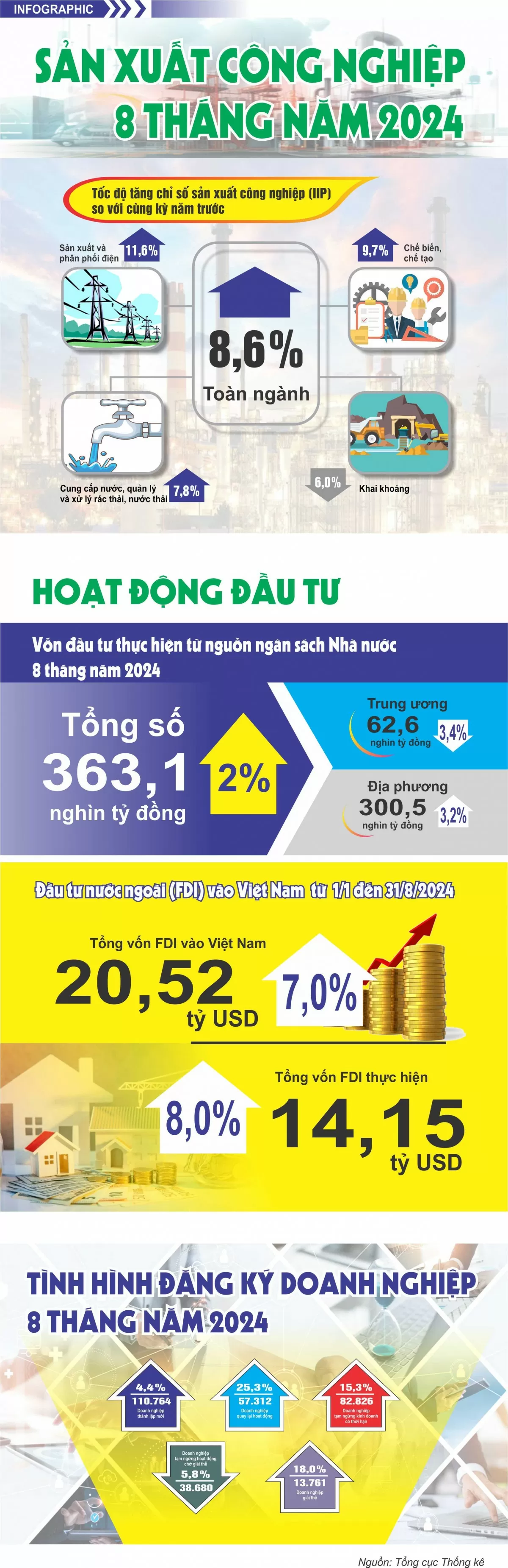 Như vậy, tính chung tám tháng năm 2024, IIP ước tính tăng 8,6% so với cùng kỳ năm trước (cùng kỳ năm 2023 giảm 0,2%). Trong khi đó, vốn đầu tư thực hiện từ nguồn ngân sách Nhà nước tháng 8/2024 ước đạt 62,1 nghìn tỷ đồng, tăng 1,3% so với cùng kỳ năm trước. Tính chung tám tháng năm 2024, vốn đầu tư thực hiện từ nguồn ngân sách Nhà nước ước đạt 363,1 nghìn tỷ đồng, bằng 47,8% kế hoạch năm và tăng 2,0% so với cùng kỳ năm trước (cùng kỳ năm 2023 bằng 48,6% và tăng 24,5%).