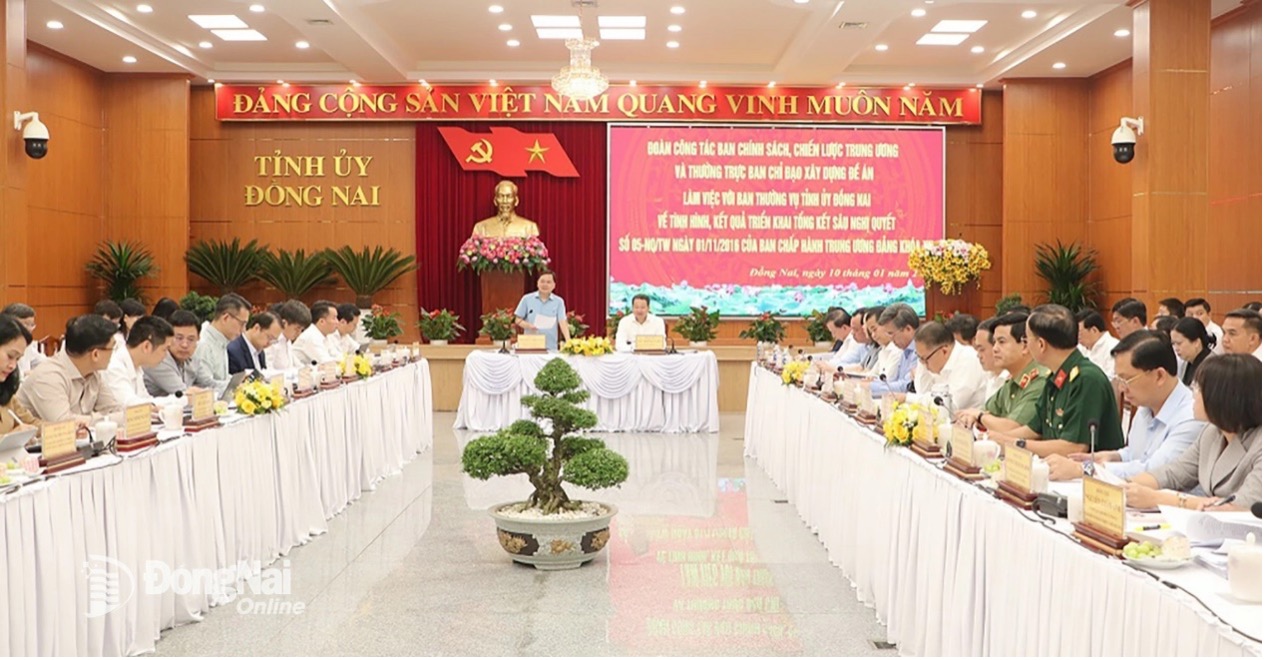 Phát biểu tại buổi làm việc, đồng chí Nguyễn Anh Tuấn, Ủy viên Trung ương Đảng, Phó Trưởng Ban Chính sách, chiến lược Trung ương đánh giá cao quá trình triển khai Nghị quyết số 05-NQ/TW của tỉnh Đồng Nai, tỉnh đã thực hiện rất quyết liệt, năm sau tăng trưởng tốt hơn năm trước. Đây là kết quả rất tốt, đặc biệt, quá trình tăng trưởng của tỉnh đã thực hiện việc đổi mới mô hình tăng trưởng với nhiều định hướng về chuyển đổi số, phát triển khoa học công nghệ. “Năm 2025, tăng trưởng của tỉnh đạt mức 9,63%, thuộc top đầu cả nước. Quy mô kinh tế, thu ngân sách đứng thứ 4 cả nước. Đồng Nai sẽ là cực tăng trưởng quan trọng của cả nước” - đồng chí Nguyễn Anh Tuấn nhấn mạnh.