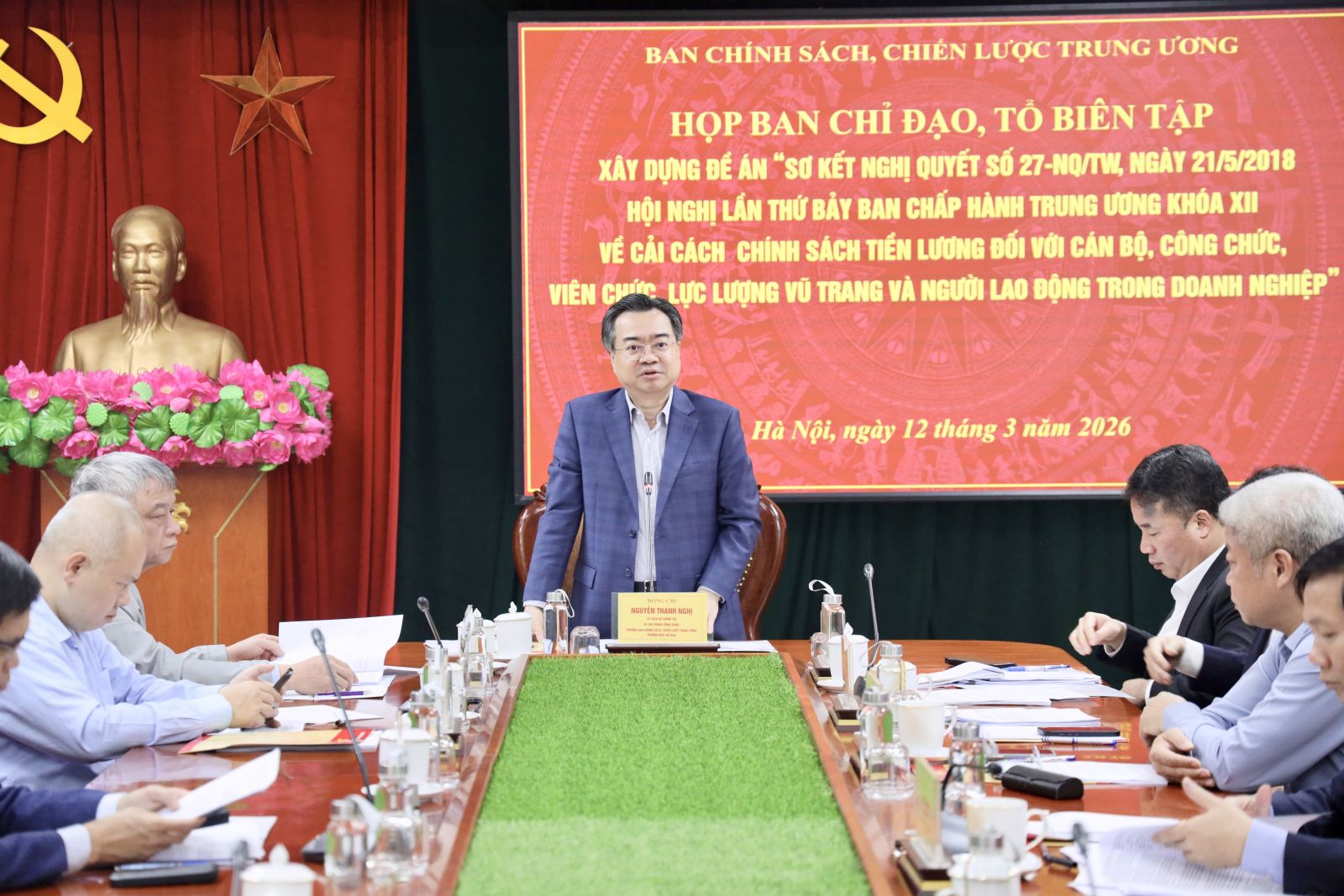 Phát biểu định hướng buổi làm việc, đồng chí Nguyễn Thanh Nghị cho biết, Ban Chính sách, chiến lược Trung ương được giao nhiệm vụ xây dựng Đề án “Sơ kết Nghị quyết 27-NQ/TW, ngày 21/5/2018 Hội nghị lần thứ bảy Ban Chấp hánh Trung ương khóa XII về cải cách chính sách tiền lương đối với cán bộ, công chức, viên chức, lực lượng vũ trang và người lao động trong doanh nghiệp”, đây là nội dung quan trọng, cấp bách hiện nay. Đồng chi cho biết từ năm 2018 đến nay chúng ta đã đạt được nhiều kết quả quan trọng trong thực hiện Nghị quyết 27-NQ/TW, tuy nhiên có một số nội dung vẫn chưa được thực hiện triệt để. Trưởng Ban nhấn mạnh, trong bối cảnh hiện nay đòi hỏi phải xác định chế độ tiền lương để sát với thực tế, dó đó cần đánh giá kỹ, nhìn thẳng vào vấn đề để đưa ra nhiệm vụ giải pháp cho giai đoạn tới. Do yêu cầu tiến độ đề án gấp, đồng chí đề nghị các thành viên Ban Chỉ đạo, Tổ Biên tập cho ý kiến thẳng thắn, trực diện về các dự thảo văn bản, đặc biệt là cho ý kiến về các tồn tại, hạn chế để từ đó đề ra quan điểm về chính sách lương mới.