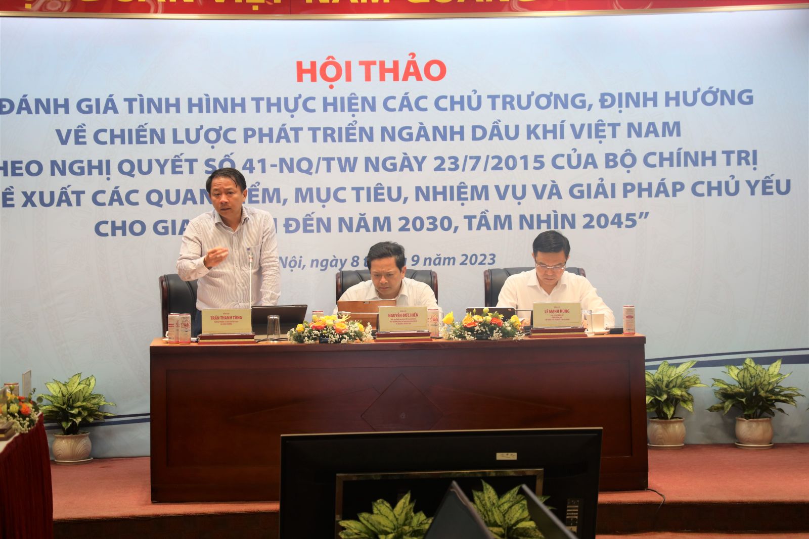Phát biểu đề dẫn tại hội thảo, đồng chí Nguyễn Đức Hiển, Phó Trưởng Ban Kinh tế Trung ương, Phó Trưởng Ban Chỉ đạo, Tổ trưởng Tổ Biên tập đã trình bày những nội dung chính của dự thảo báo cáo Đề án đánh giá tình hình triển khai thực hiện Nghi quyết số 41-NQ/TW. Đồng chí nhấn mạnh, Tổ Biên tập xây dựng Đề án mong muốn lắng nghe ý kiến góp ý của các chuyên gia, nhà quản lý của PVN và các bộ ngành liên quan vào các nội dung lớn, trọng tâm vào dự thảo Đề án như: công tác tuyên truyền, triển khai Nghi quyết 41-NQ/TW đặc biệt là vấn đề thể chế hóa; kết quả thực hiện các quan điểm, mục tiêu tổng quát, mục tiêu cụ thể; thảo luận, đánh giá về kết quả đạt được, hạn chế, tồn tại và nguyên nhân; đánh giá việc thực hiện các nhiệm vụ, giải pháp;… Đồng chí cũng đề nghị các chuyên gia nêu nhận định, thảo luận một cách thẳng thắn, khách quan về bối cảnh trong nước, quốc tế; đề xuất quan điểm, mục tiêu, định hướng cụ thể, đặc biệt là những vấn đề lớn như: thị trường dầu khí, xây dựng hạ tầng ngành dầu khí; về thu hút, nâng cao hiệu quả sử dụng vốn đầu tư, phát triển khoa học - công nghệ, đổi mới sáng tạo; phát triển nguồn nhân lực chất lượng cao; về hợp tác quốc tế, tăng trưởng xanh, phát triển bền vững ngành Dầu khí, trong đó Tập đoàn Dầu khí Quốc gia Việt Nam giữ vai trò hạt nhân với tư cách là tập đoàn công nghiệp năng lượng quốc gia.