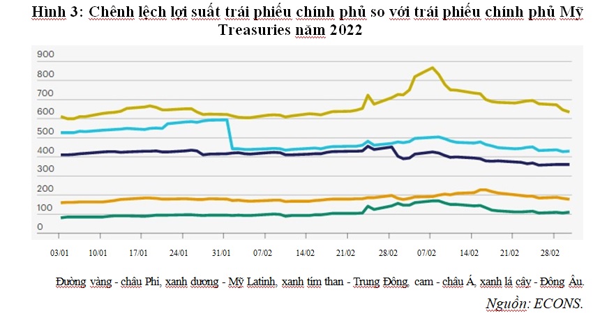 Thực ra, tác động từ sự bất định do cuộc xung đột Nga-Ukraine đối với việc lãi suất tăng ở các nước đang phát triển không đồng nhất. Việc loại bỏ những chênh lệch lợi tức đối với trái phiếu chính phủ bằng USD ra khỏi các đợt tăng lãi suất trên thế giới do lạm phát toàn cầu và thắt chặt chính sách tiền tệ là nhờ sự chênh lệch lợi suất giữa trái phiếu chính phủ của các nền kinh tế mới nổi và trái phiếu chính phủ Mỹ (Treasuries). Hình 3 cho thấy rằng đến đầu tháng 4/2022, chênh lệch lợi suất trái phiếu chính phủ Mỹ ở nhiều khu vực đang trở lại mức “yên bình”. Ngoại trừ khu vực Đông Âu bởi những lý do rõ ràng, tuy nhiên ngay cả ở đó lợi suất, có vẻ như, cũng đã qua ngưỡng đỉnh.