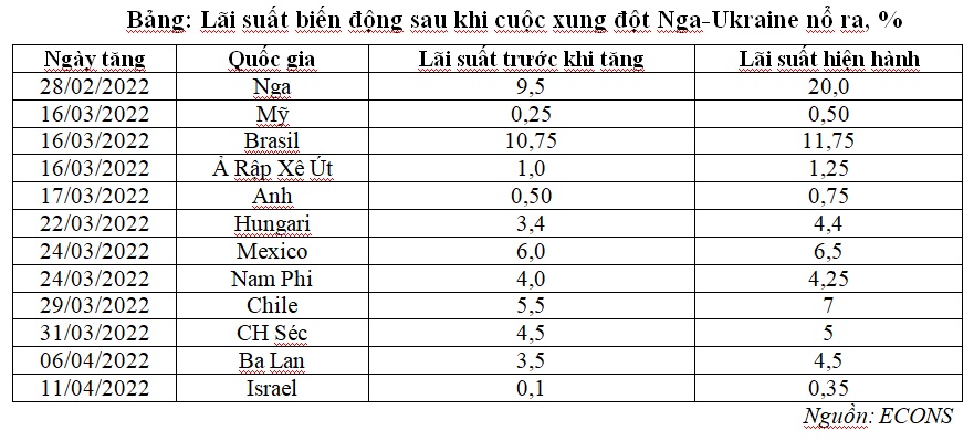 Các nền kinh tế chủ chốt trên thế giới đã thực hiện chính sách thắt chặt tiền tệ để chống lạm phát, mà bắt đầu tăng mạnh vào năm ngoái. Kể từ tháng 12/2021 , Ngân hàng Trung ương Anh (BoE) đã 3 lần tăng lãi suất. Cục Dự trữ liên bang Mỹ (FED), lần đầu tiên kể từ năm 2018 , thực hiện biện pháp này trong tháng 3 với những cảnh báo đầy cứng rắn hơn, khi cuộc xung đột Nga-Ukraine bùng phát, và mới đây nhất vào ngày 15/6/2022, cơ quan này đã quyết định tăng lãi suất cơ bản thêm 0,75 đpt lên mức 1,5%-1,75% - mức tăng lãi suất lớn nhất trong vòng 28 năm. Thị trường dự báo có thể còn thêm 5-6 lần tăng lãi suất nữa từ nay đến cuối năm . Ngân hàng Trung ương châu Âu (ECB) cũng không loại trừ việc tăng lãi suất trong quý IV/2022 , và kể từ khi bắt đầu cuộc xung đột Nga-Ukraine, các ngân hàng trung ương của hơn một chục nền kinh tế quan trọng trên thế giới, bao gồm Nga, Mỹ và Anh, đã tăng lãi suất.